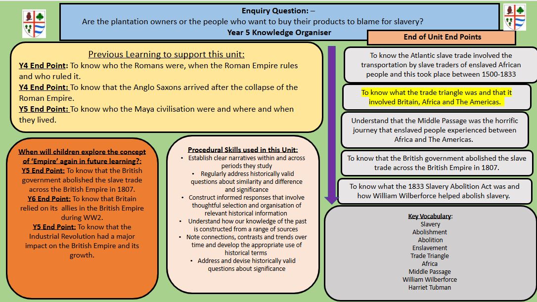 In History we will be learning about the Atlantic Slave Trade including the Trade Triangle, the treatment of slaves as well as the abolishment of the Atlantic Slave Trade.